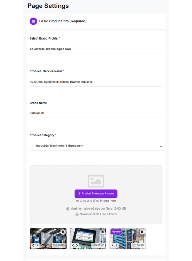 Product Gallery — up to 5 images. Close-ups, packaging, certification labels, product-in-use photos.