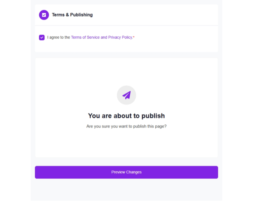 Same as Brand Page: check the terms, click Submit. Translation and deployment are automatic.