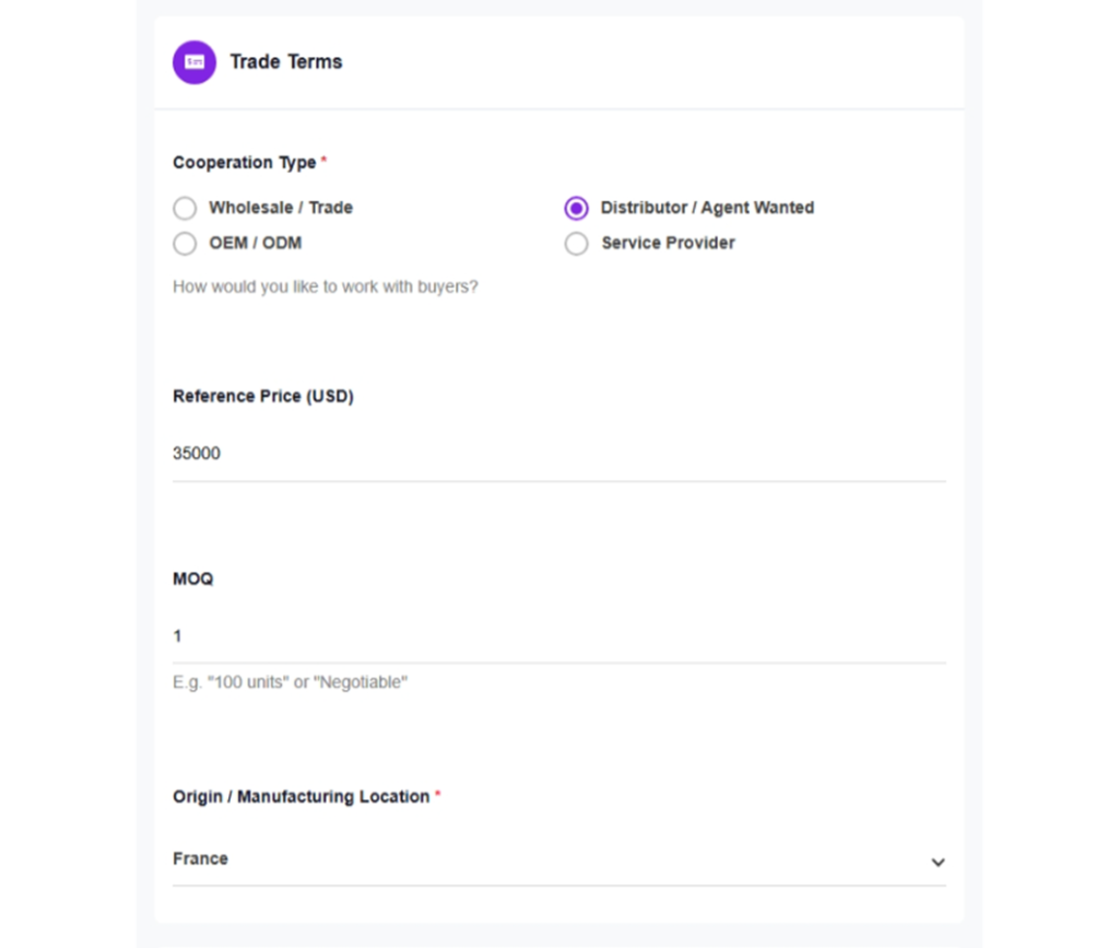Setting your Reference Price: optional but recommended. Enter a starting price or typical unit price. Buyers understand this is a starting point for negotiation.