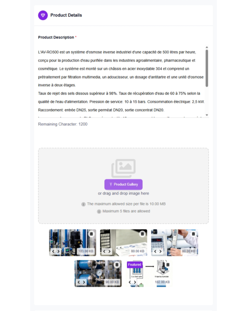 Start with what the product is and what it does. Then cover key specs (dimensions, materials, capacity). Add who uses it and for what. List certifications (ISO, CE, FDA). End with why a buyer should pick you.